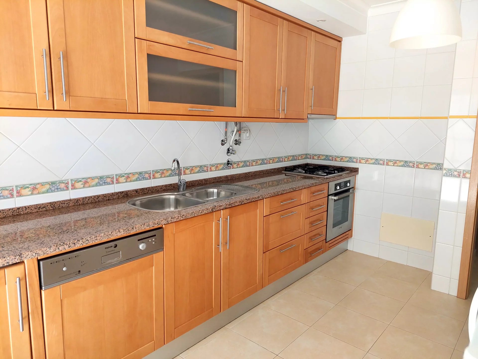 The kitchen is equipped with an oven, hob, dishwasher, washing machine and fridge, as well as offering a functional space for preparing meals.
