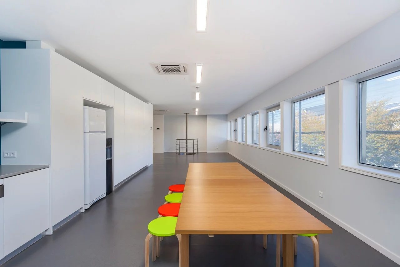 With a total area of 418 m², the property offers two large open-plan areas, a private office and a meeting room, allowing it to be adapted to different models of internal organization. It also has four bathrooms, a pantry equipped with a dining and lounge area, and a small technical area ideal for servers or storage. The office is fully equipped with electrical and data cabling, air conditioning in all rooms and a heat-treated roof, ensuring comfort and operational efficiency.