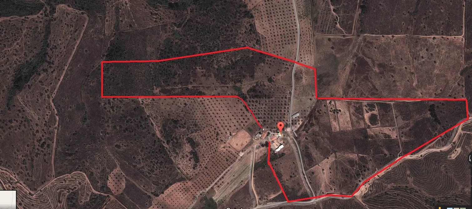 - Diverse area with olive groves, cork oak forests, eucalyptus trees and cultivated fields, all fenced off.