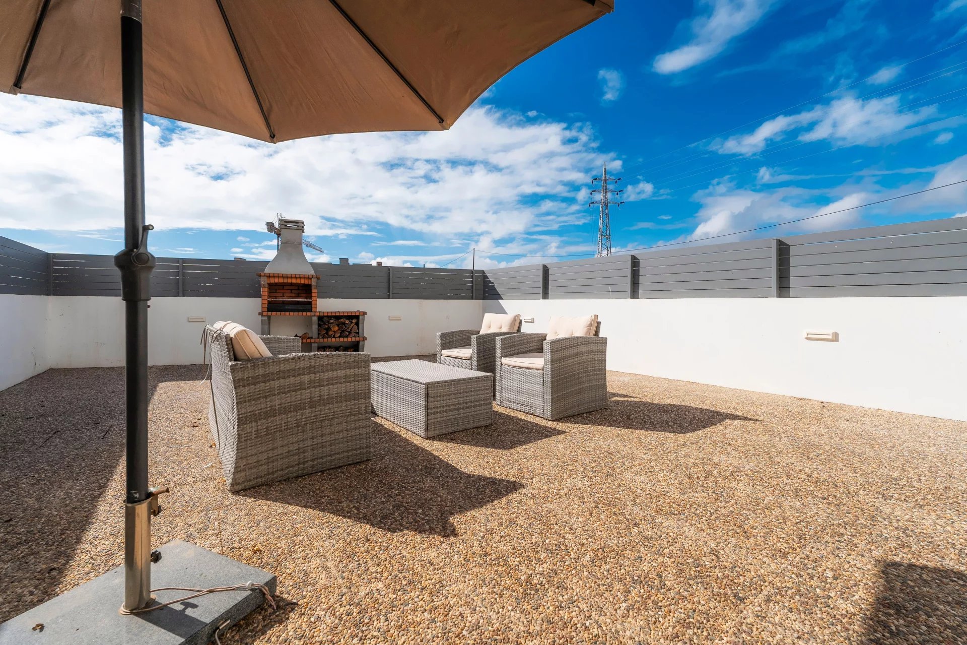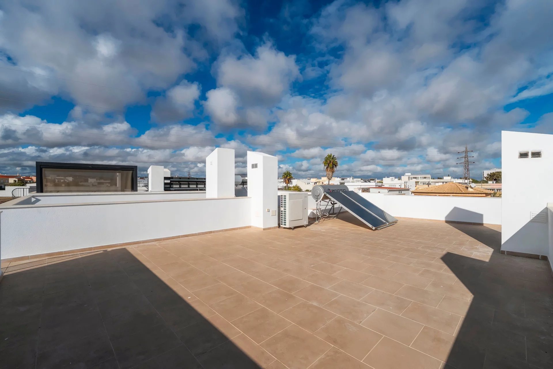 A moradia dispõe ainda de um agradável pátio com zona de churrasco, perfeito para momentos de lazer, e de um espaçoso terraço na cobertura com painéis solares, que permite desfrutar do sol e da vista sobre a envolvente. O estacionamento para dois carros, o sistema de videovigilância e os acabamentos de qualidade reforçam a sensação de segurança e bem-estar.