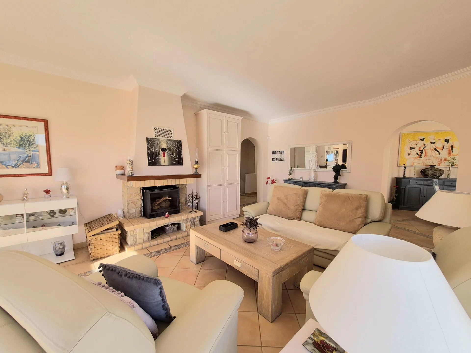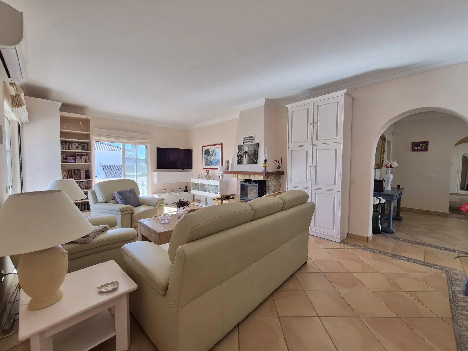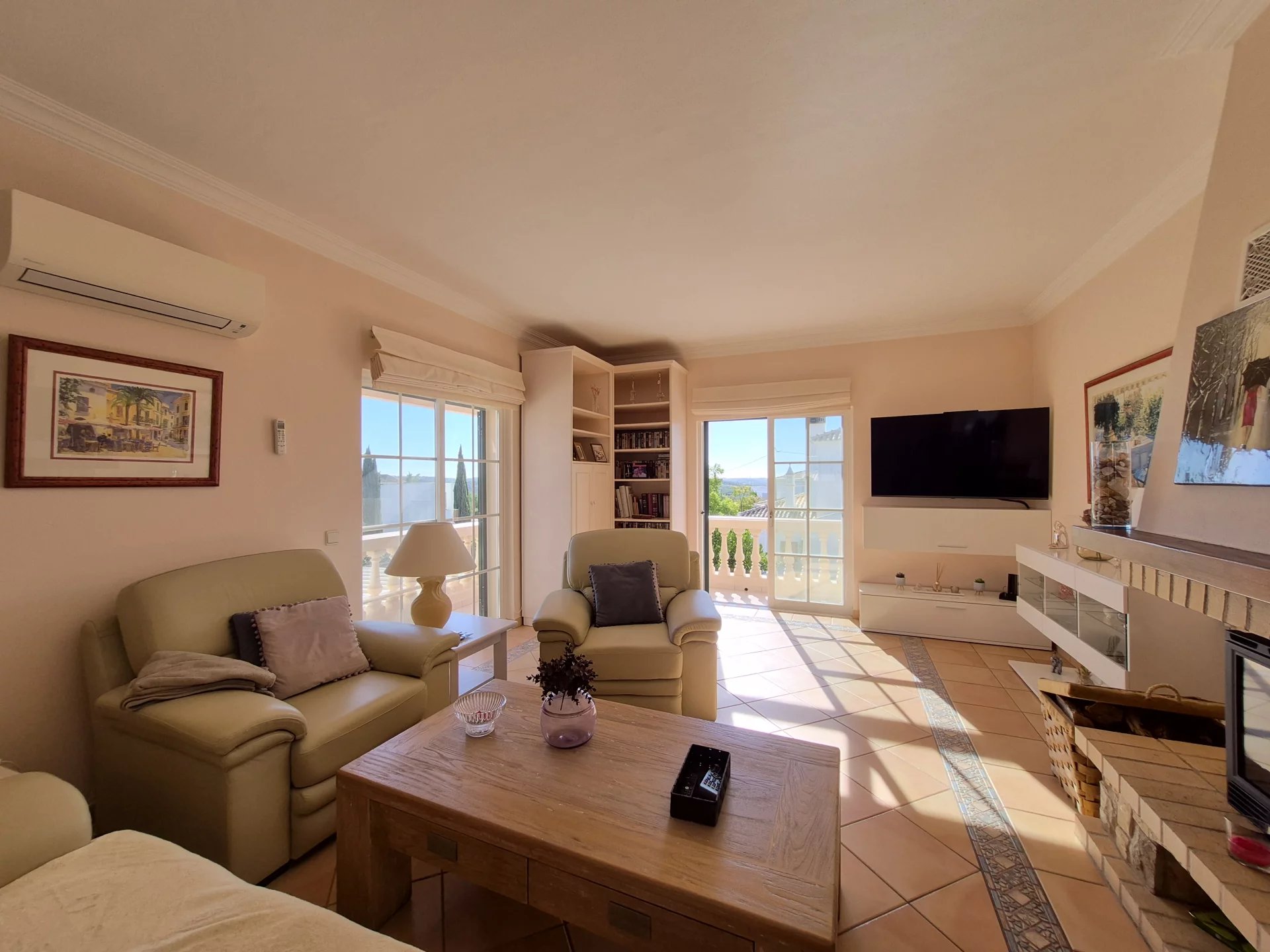 - Sala de estar com lareira e salamandra, com acesso a um terraço soalheiro com vista panorâmica