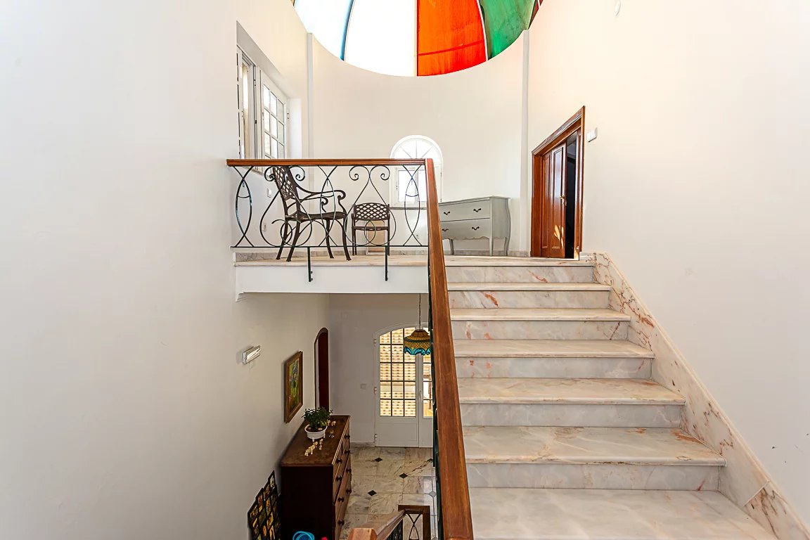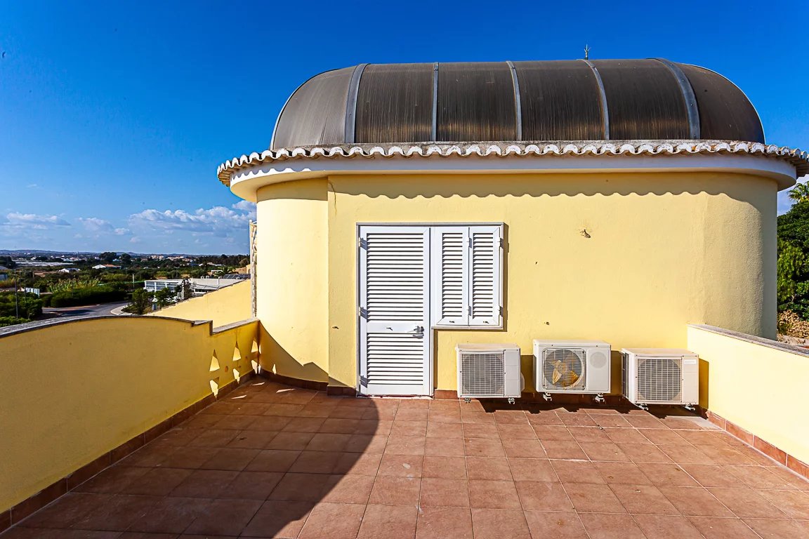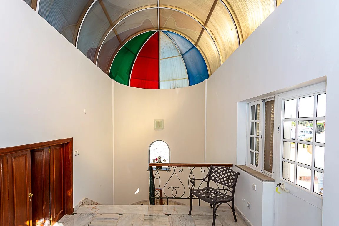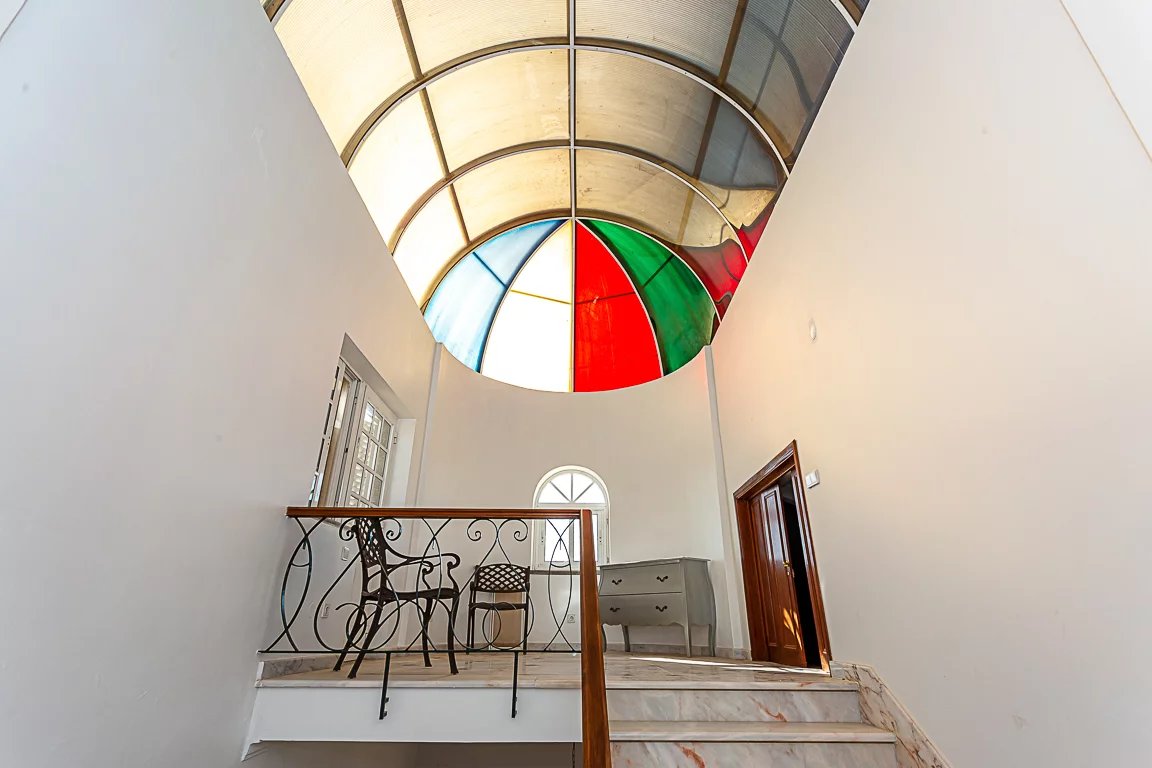 Uma luminosa escadaria transporta-nos para a cobertura onde encontramos um fabuloso tecto com uma fantástica abóbada de vidro, um pequeno sótão e um espectacular terraço com uma vista deslumbrante para o mar, Altura e a Praia Verde.