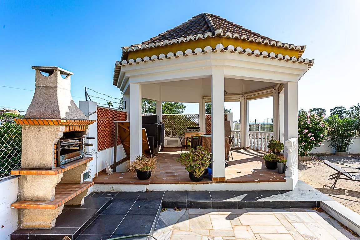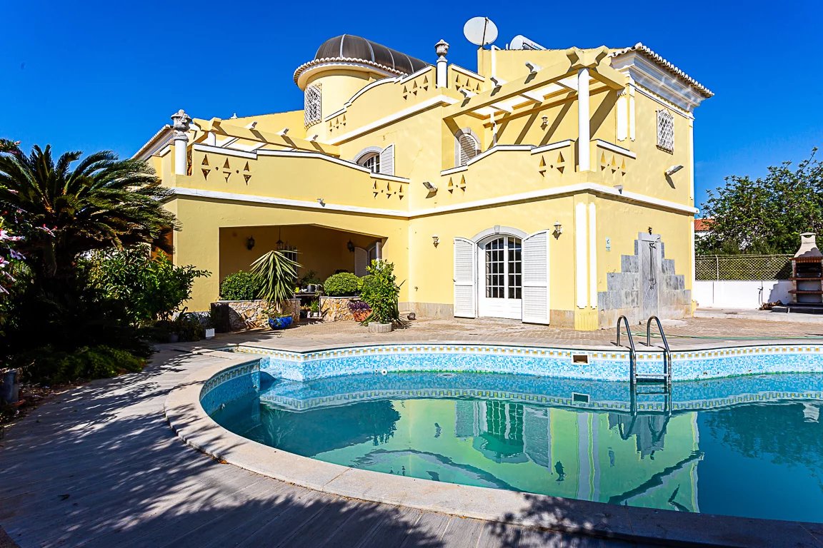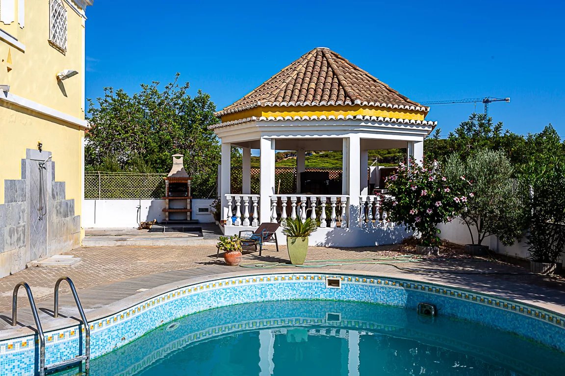 No espaço exterior somos contemplados com um bonito jardim, uma piscina acolhedora que convida a mergulhos nos dias quentes de verão, um fantástico e charmoso coreto, BBQ, garagem e arrecadação.